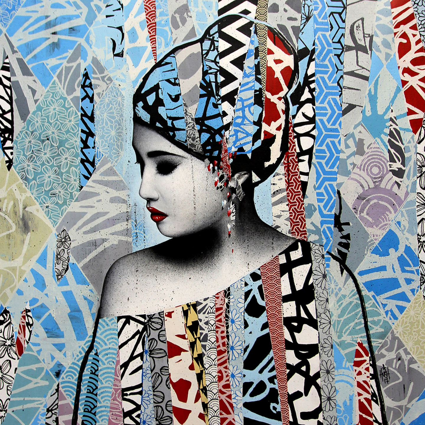 Hush’s art now resembles fine art portraiture; high decorative and with a higher level of finesse. But that doesn’t mean he has lost touch with the street art world; far from it. His murals are ever-present and constantly evolving. Hush’s art prints are gorgeously executed, but done so with a rawness that can only be achieved with years on the street, mastering his style.